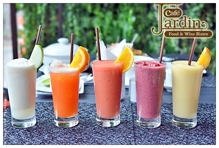 ร้าน Café Jardin นี้ตั้งอยู่บริเวณชั้นล่างของโรงแรม ภายในร้านตกแต่งได้สวยงามน่านั่ง เห็นว่ากองถ่ายละครหลายๆ เรื่องก็ตบเท้ากันเข้ามาใ้ช้สถานที่ในการถ่ายทำอยู่บ่อยๆ หลังจากเก็บรูปโดยรอบจนครบ พวกเราก็เปิดประเดิมด้วยเครื่องดื่มเบาๆ อย่าง Smoothies จัดมาถึงสี่ชนิดด้วยกัน เริ่มจาก Be Cool (Ripe mango,lychee and beetroot - 140 บาท) รสชาติเย็นๆชื่นใจ ตามต่อด้วย Berry Gangster (Blueberry, Raspberry, strawberry, youghurt and honey - 140 บาท) ที่ให้รสเปรี้ยวของเบอร์รี่แท้ๆ ถัดมาเป็น Ploenchit (Green apple,lychee,milk,yoghurt and honey - 140 บาท) ที่ให้รสชาติหวานหอมของแอปเปิลเขียว และซ่อนเปรี้ยวจากลิ้นจี่เป็นหลัก ปิดท้ายเมนูน้ำปั่นด้วย Mango Delight