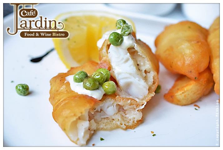 เพลิดเพลินกับเครื่องดื่มได้ไม่นานนัก Starter ก็พร้อมเสิร์ฟ งานนี้เริ่มด้วย หมูหมักวาซาบิ (Wasabi Pork - Pork Slices marinated in wasabi and spices - 120 บาท) ที่หน้าตาละม้ายคล้ายหมูมะนาวแบบไทยๆ ผสมผสานกับวาซาบิจากญี่ปุ่น เนื้อหมูนุ่มๆ เข้ากันได้กับเครื่องปรุงอย่างไม่น่าเชื่อ จานถัดมายังคงเป็น Concept อาหารไทยประยุกต์อย่าง ทาโก้ลาบไก่ Larb Taco with Crème Fraiche - Taco with Thai-style larb filiing and French sour cream - 180 บาท) เสิร์ฟพร้อครีมข้นสไตล์ฝรั่งเศสรสเปรี้ยว ตัวแป้งทาโก้กรอบๆ ได้กลิ่นข้าวโพดเวลารับประทาน ส่วนลาบไก่นั้นรสอ่อนไปนิด ต่อด้วยเมนูสลัดกันบ้าง Café Jardin Salad (Garden green salad with cooked ham, steamed prawns, smoked chicken and cheese served with home style French or thousand island dressing - 220 บาท) ชุดสลัดหน้าตาดีที่ให้มาชุดใหญ่ ผักสดๆ ทานคู่กับชีสหอมๆทานคู่และไก่รมควันนุ่มๆ