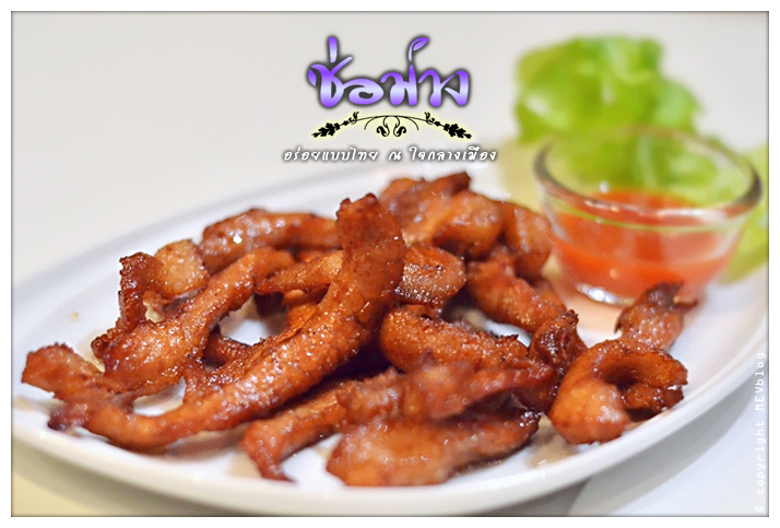 ร้านช่อม่วง ตั้งอยู่บริเวณชั้น 6A ของสยามดิสคัฟเวอรี ตกแต่งสไตล์ Vintage บรรยากาศของร้านอาหารในบริเวณนี้ถือได้ว่าเหมาะแก่การนั่งรับประทานอาหารแบบไม่ต้องเร่งหรือรอคิวเหมือนร้านดังๆ ส่วนใหญ่ในสยาม วันนี้เรามีสมาชิกทั้งหมด 5 คน ซึ่งเดินทางฝ่าการจราจรที่แน่นหนามหาศาลมาจากในหลายทิศ เมื่อมาถึงร้านพวกเราก็พร้อมใจกันจัดหนักทันที เริ่มจากเมนูแนะนำอย่าง หมูคำหวาน (120 บาท) ที่เปิดตัวมาอย่างถูกใจพวกเราอย่างมาก เนื้อหมูหมักมาอย่างดี ไม่หวานจัดเหมือนอย่างหมูหวานทั่วไป มีรสเค็มมันประกอบ ทอดออกมาได้กำลังพอเหมาะ ไม่แข็งจนเกินไป สมกับเป็นเมนูแนะนำของร้านจริงๆ รายการต่อมายังคงเป็นของทานเล่นอย่าง ปอเปี๊ยะทอด (100 บาท) ที่หั่นมาชิ้นพอดีคำ ถึงแม้ว่าจะเป็นเมนูพื้นฐานแต่ก็ถือว่าสอบผ่าน