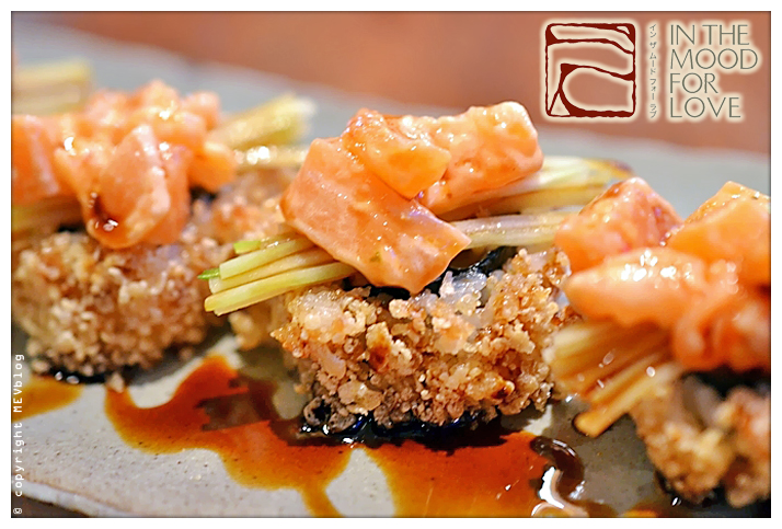 เมื่อนั่งดื่มด่ำกับบรรยากาศซักพัก ก็เริ่มสั่งเครื่องดื่มและอาหาร เริ่มจากค็อกเทลสูตรเด็ดชื่อเดียวกับร้าน In The Mood For Love ที่รสชาติเปรี้ยวอมหวานนำ ตามมาด้วยความหอมของโซจูและสาเก ถัดมาเป็นจุดเด่นของร้านคือ โรล (Rolls) ต่างๆที่มีให้เลือกมากมายหลายแบบ เราได้สั่งโรลชื่อ C4 ที่ทานแล้วให้ความรู้สึกเหมือนชื่อจริงๆ โดยตัวโรลทอดผิวนอกมากรอบๆ แต่งหน้าด้วยแตงกวาและปลาแซลมอน เมื่อกัดแล้วมีรสเผ็ดระเบิดในปาก แต่ก็ไม่ได้เผ็ดมากจนเกินไป เป็นเมนูที่สร้างสรรค์และอร่อยสมเป็นหมวดเมนูที่ทางร้านภูมิใจ